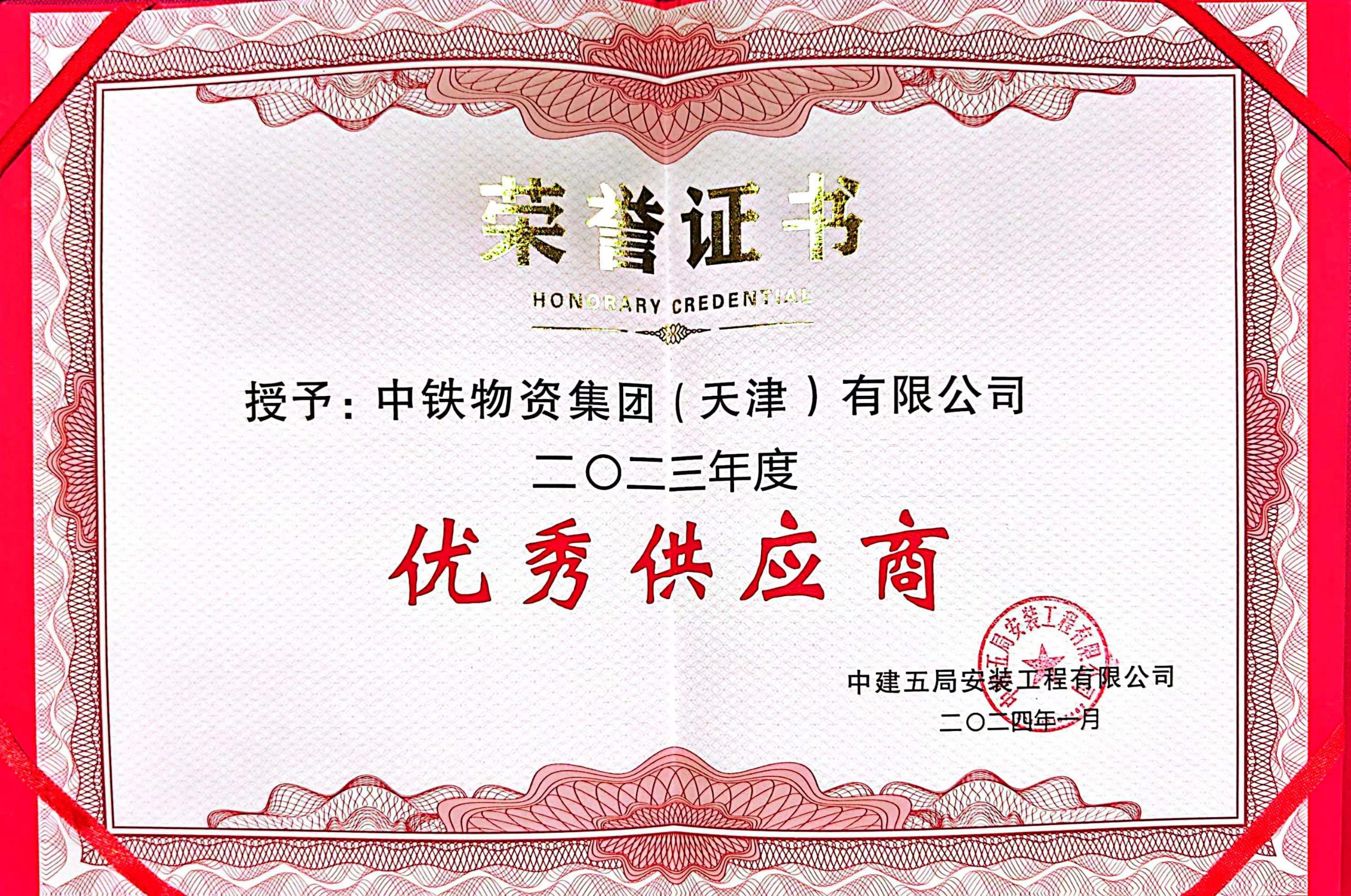 1月25日,中建五局安裝公司2023年度分供方答謝會暨優秀分供方表彰大會在深圳召開,中鐵物資集團天津公司受邀參加并被授予2023年度“優秀供應商”稱號。 長期以...